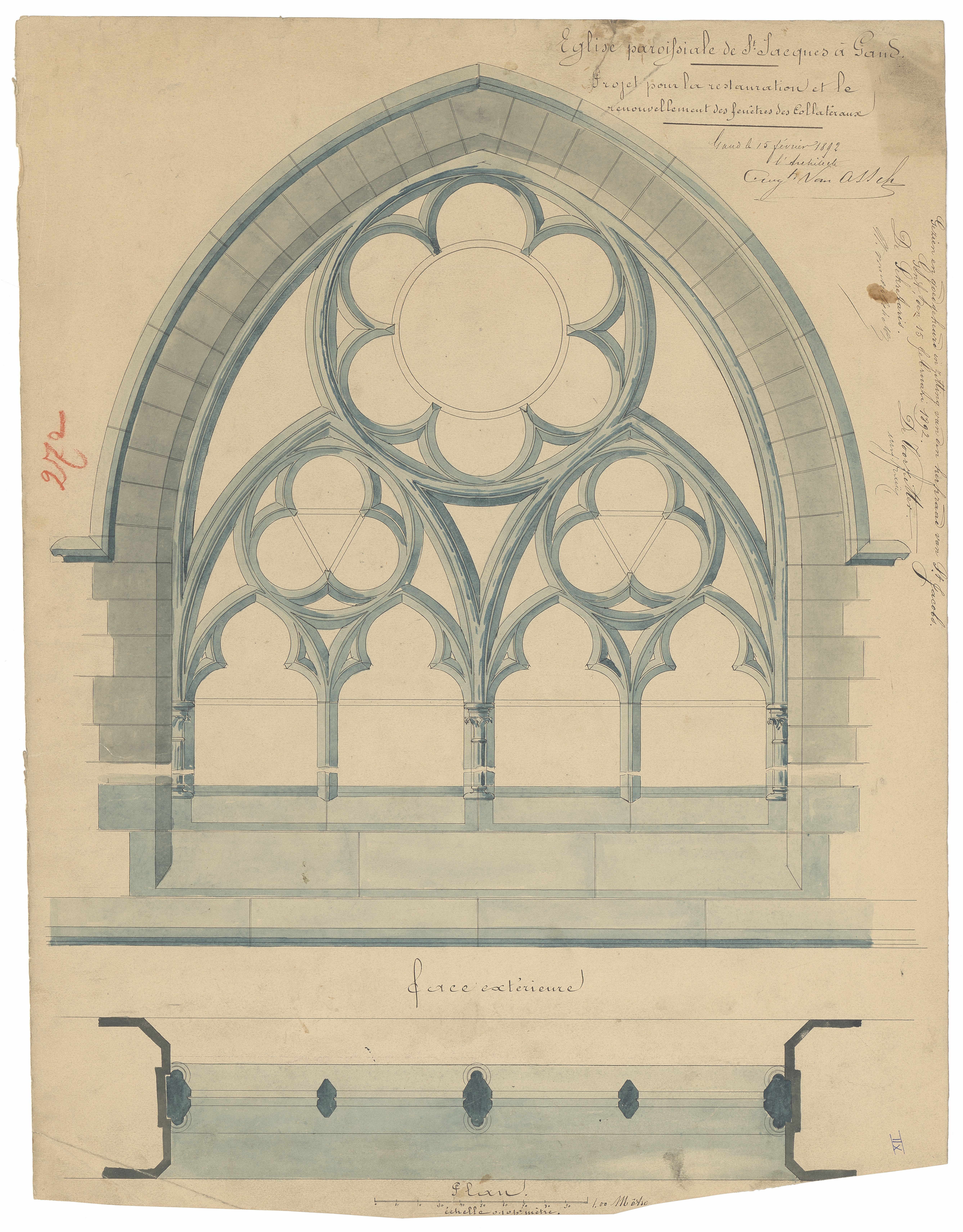 Opschrift: Eglise paroissiale de St. Jacques à Gand. Projet pour la restauration et la renouvellement des fenêtres des collatéraux. Omschrijving plan: plattegrond en vooraanzicht raam Datum KCML: deze informatie wordt niet vermeld op het archiefstuk Archiefnummer: O1551