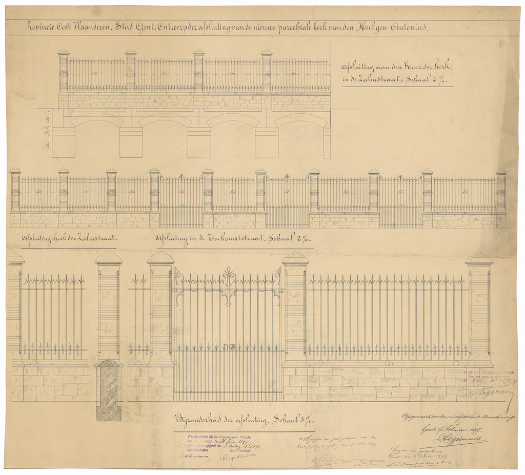 Opschrift: Provincie Oost-Vlaanderen. Stad Gent. Ontwerp der afsluiting van de nieuwe parochiale kerk van den Heiligen Antonius. Omschrijving plan: ontwerp afsluiting Datum KCML: 26/06/1897 Archiefnummer: O1519