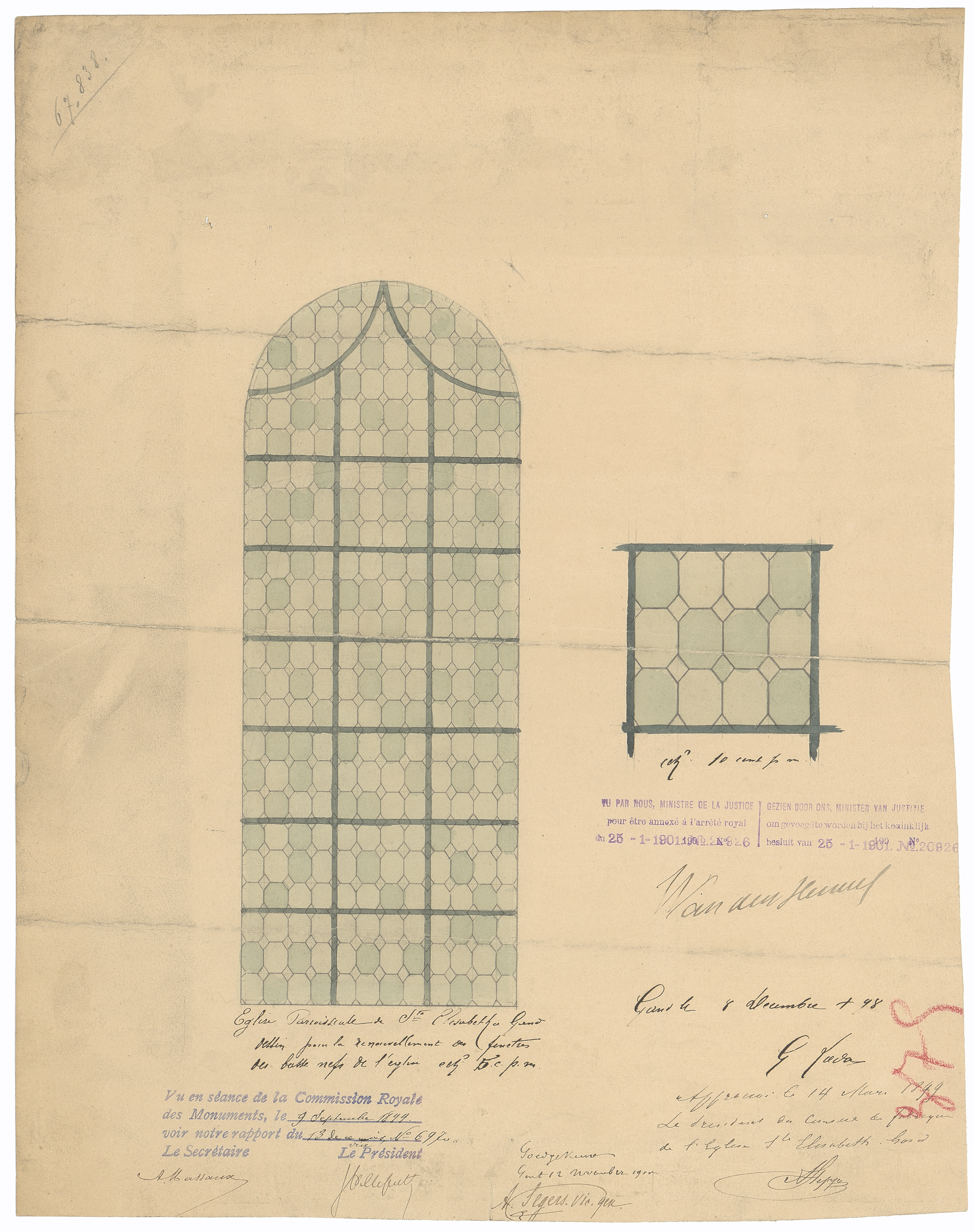 Opschrift: Eglise Parroissiale de St. Elisabeth a Gand. Dessin pour le renouvellement des fenêtres des basse nefs de l'eglise. Omschrijving plan: ontwerp raam Datum KCML: 09/09/1899 Archiefnummer: O1541