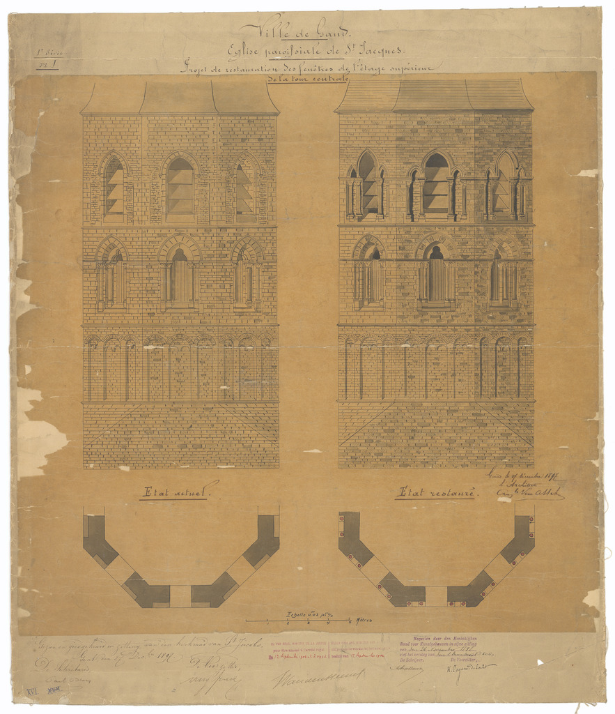 Opschrift: Ville de Gand. Eglise paroissiale de St. Jacques. Projet de restauration des fenêtres de l'étage supérieure de la tour centrale. Omschrijving plan: plattegrond en opstand toren Datum KCML: 26/11/1898 Archiefnummer: O1552