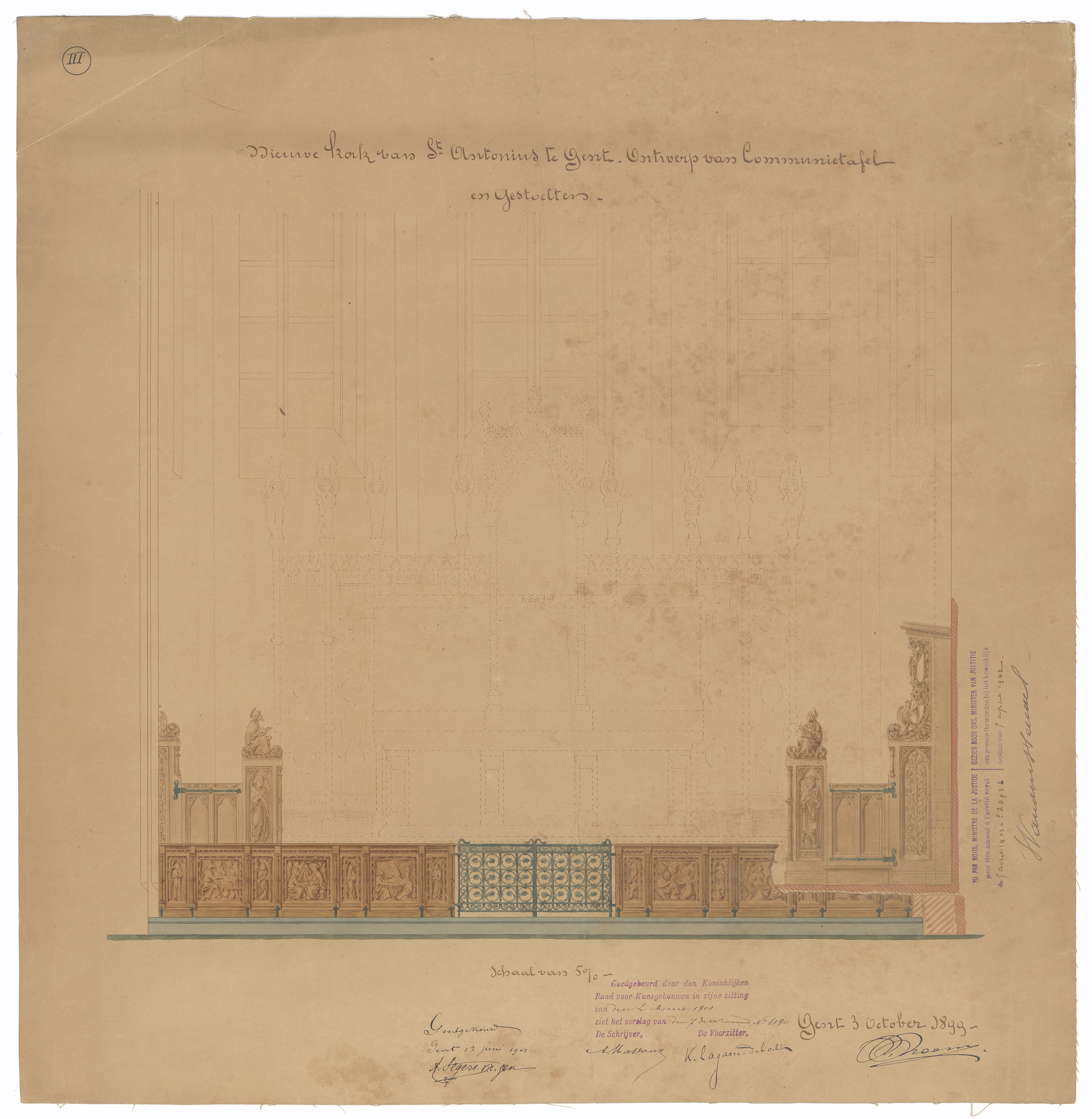 Opschrift: Nieuwe kerk van St. Antonius te Gent. Ontwerp van Communietafel en gestoelten Omschrijving plan: vooraanzicht communiebank, zijaanzicht gestoelte Datum KCML: 2 /03/1901 Archiefnummer: O1521