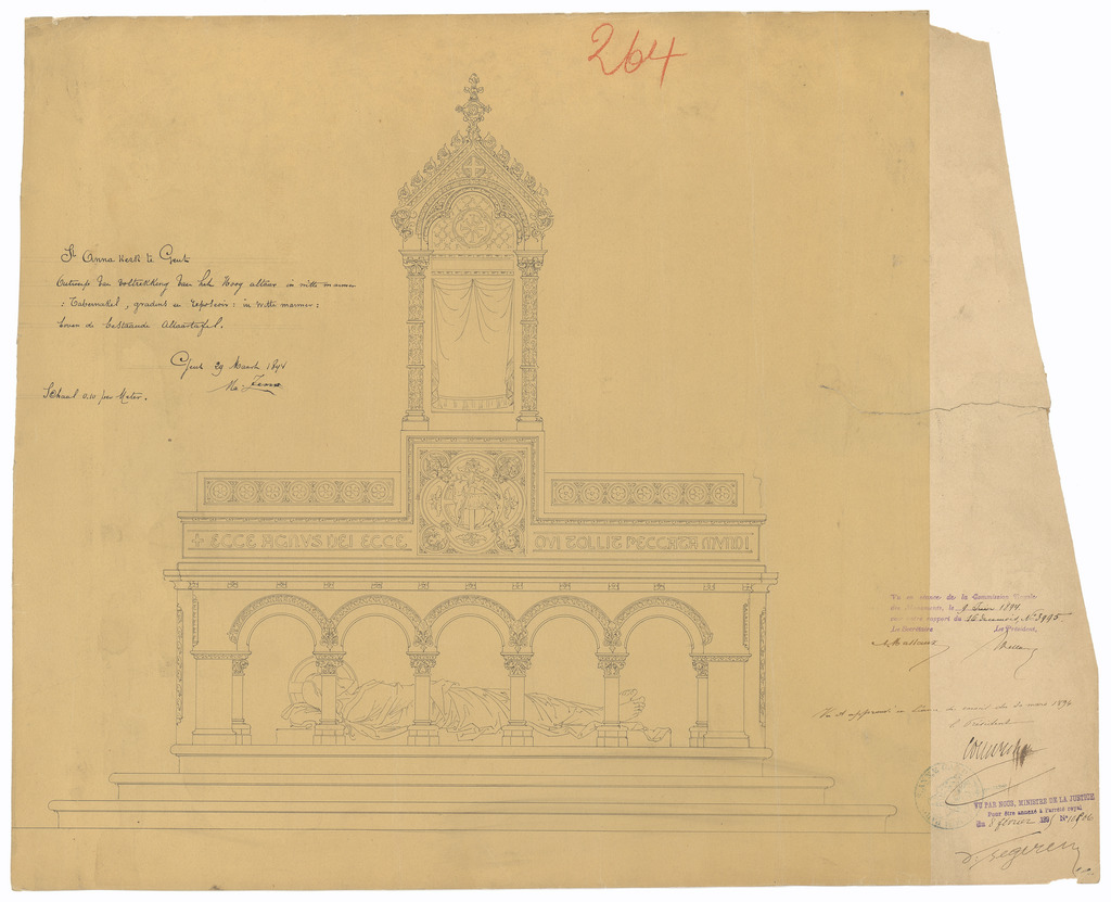 Opschrift: St. Anna Kerk te Gent. Ontwerp van voltrekking van het Hoog altaar in witte marmer. Omschrijving plan: vooraanzicht hoogaltaar Datum KCML: 09/06/1894 Archiefnummer: O1503