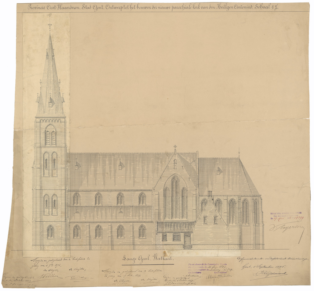 Opschrift: Provincie Oost-Vlaanderen. Stad Gent. Ontwerp tot het bouwen der nieuwe parochiale kerk van den Heiligen Antonius. Omschrijving plan: opstand W-gevel Datum KCML: 26/06/1897 Archiefnummer: O1515