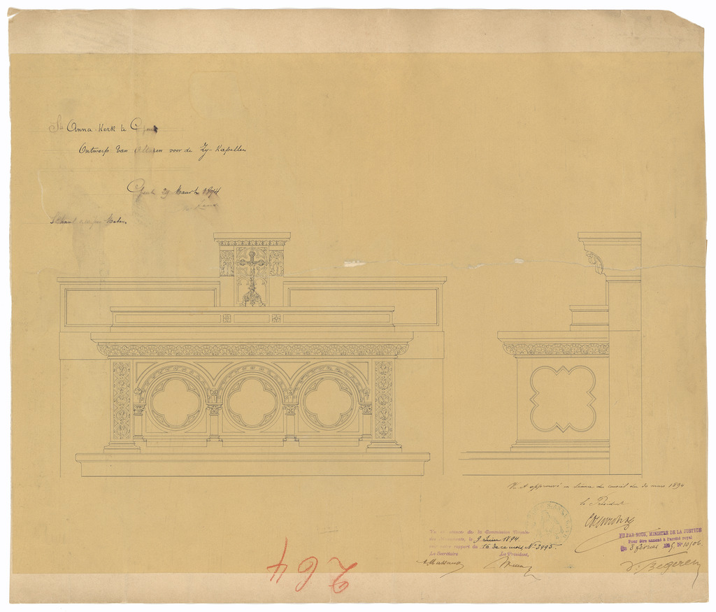 Opschrift: Ste. Anna Kerk te Gent. Ontwerp van Altaren voor de Zij-Kapellen. Omschrijving plan: voor- en zijaanzicht zijaltaar Datum KCML: 09/06/1894 Archiefnummer: O1504