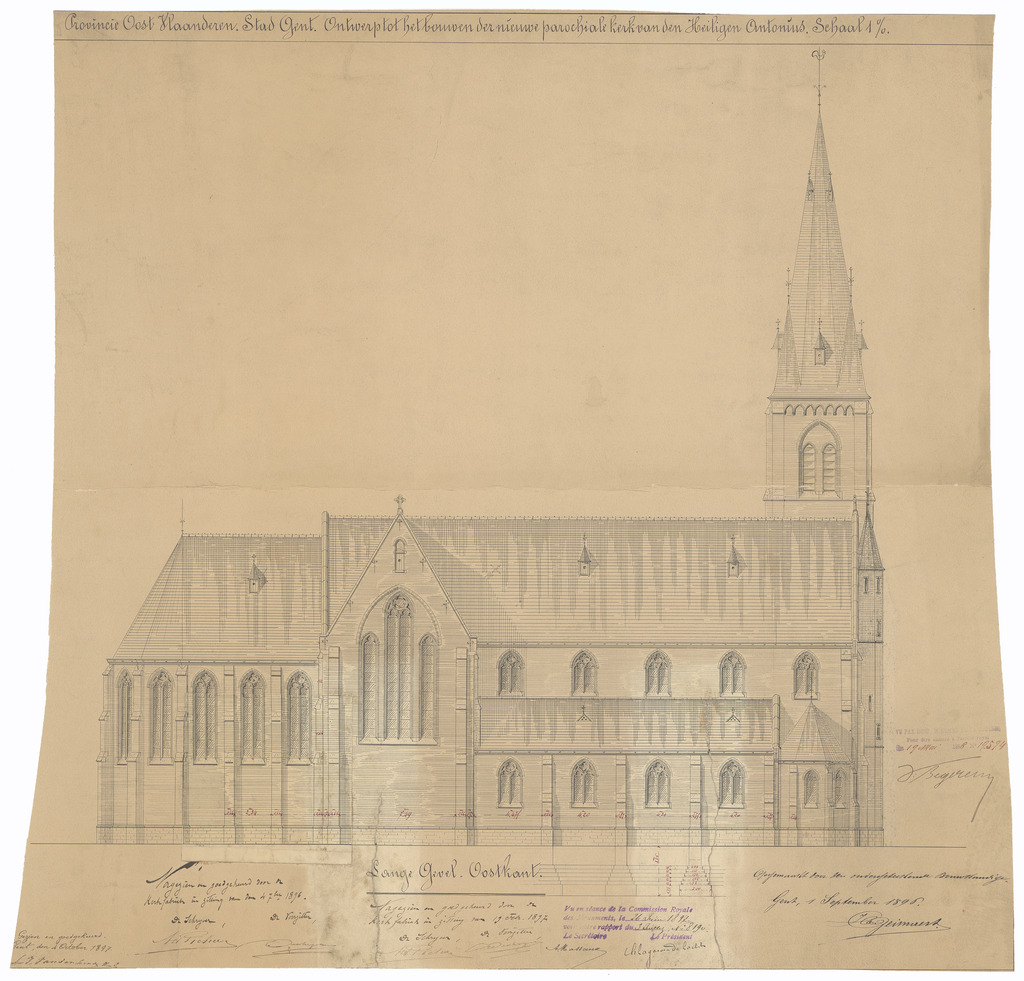 Opschrift: Provincie Oost-Vlaanderen. Stad Gent. Ontwerp tot het bouwen der nieuwe parochiale kerk van den Heiligen Antonius. Omschrijving plan: opstand O-gevel Datum KCML: 26/06/1897 Archiefnummer: O1516
