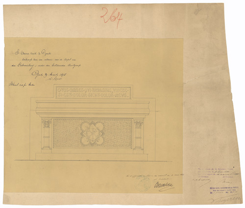 Opschrift: Ste. Anna Kerk te Gent. Ontwerp van een altaar voor de Kapel van den Calvarieberg; onder den bestaanden kruisgroep Omschrijving plan: vooraanzicht altaar Datum KCML: 09/06/1894 Archiefnummer: O1505
