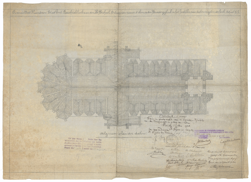 Opschrift: Provincie Oost-Vlaanderen. Stad Gent. Parochiale kerk van den H. Michaël. Ontwerp van nieuwe daken op den Noorderzijbeuk en het herstellen van daken en goten der kerk. Omschrijving plan: plattegrond bedaking Datum KCML: 10/07/1920 Archiefnummer: O1609