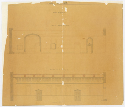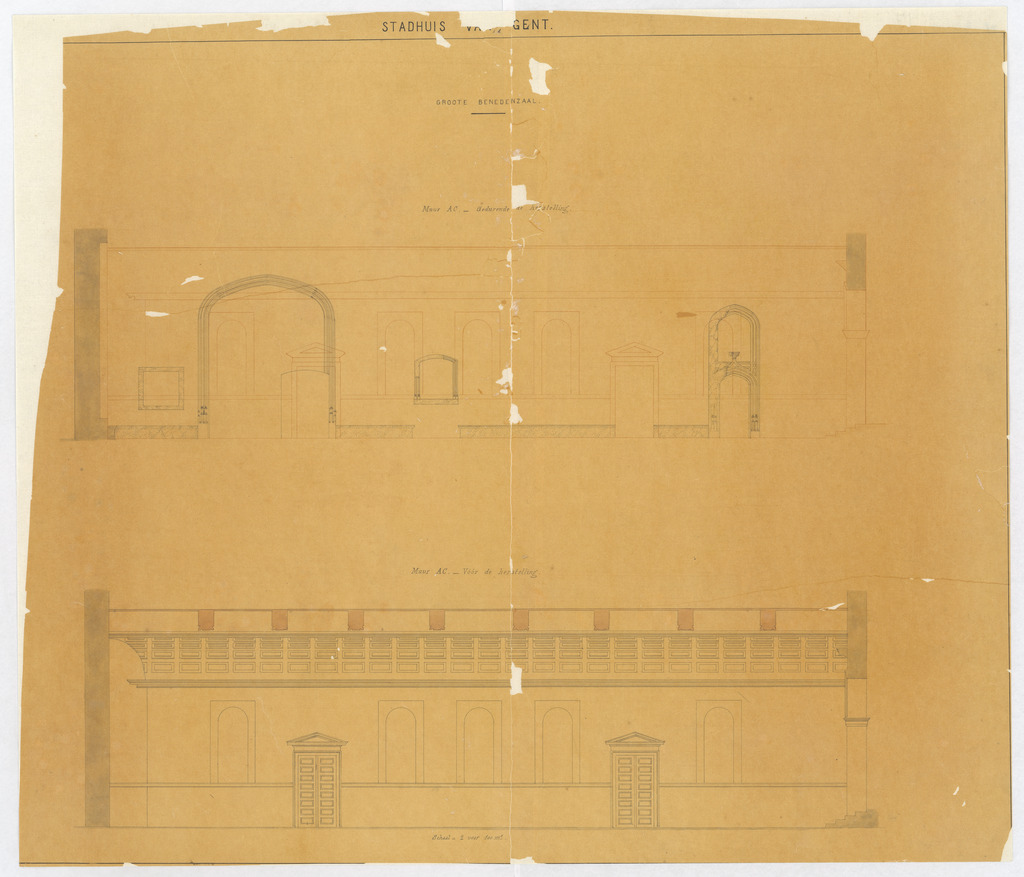 Opschrift: Stadhuis van Gent. Groote benedenzaal. Omschrijving plan: opstanden binnenmuren Datum KCML: deze informatie wordt niet vermeld op het archiefstuk Archiefnummer: O1698