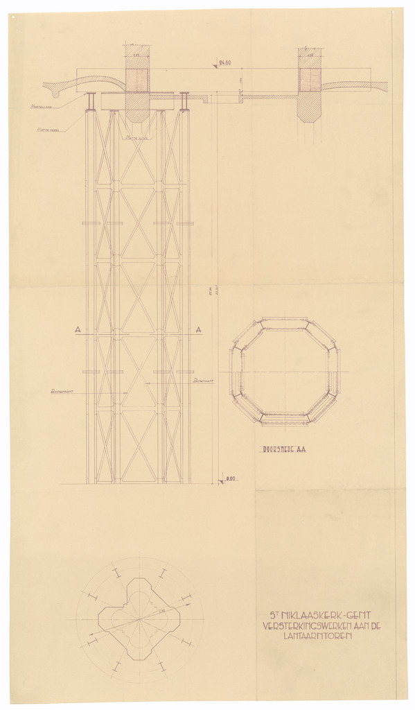 Opschrift: St. Niklaaskerk - Gent. Versterkingswerken aan de lantaarntoren Omschrijving plan: detailtekeningen lantaarntoren Datum KCML: deze informatie wordt niet vermeld op het archiefstuk Archiefnummer: O1630