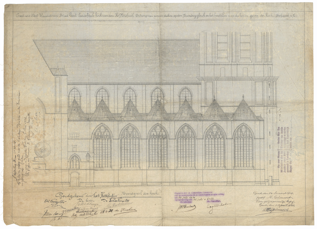 Opschrift: Provincie Oost-Vlaanderen. Stad Gent. Parochiale kerk van den H. Michaël. Ontwerp van nieuwe daken op den Noorderzijbeuk en het herstellen van daken en goten der kerk. Omschrijving plan: opstand N-gevel Datum KCML: 10/07/1920 Archiefnummer: O1611