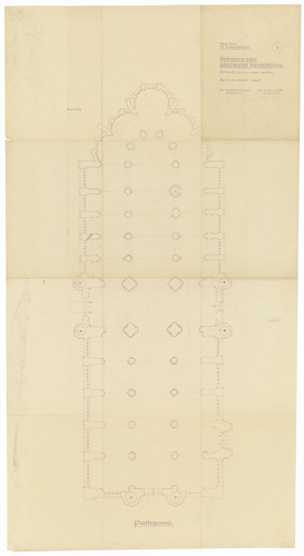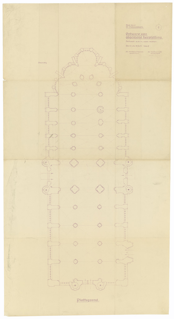 Opschrift: Stad Gent. St. Niklaaskerk: Ontwerp van algemene herstelling. Omschrijving plan: plattegrond niveau 0 Datum KCML: deze informatie wordt niet vermeld op het archiefstuk Archiefnummer: O1616
