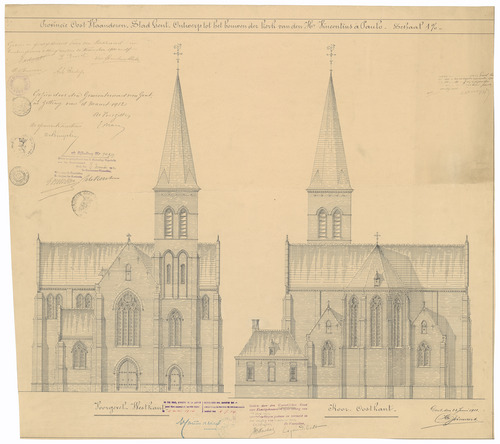 Opschrift: Provincie Oost-Vlaanderen. Stad Gent. Ontwerp tot het bouwen der kerk van den H.Vincentius à Paulo. Omschrijving plan: opstanden voor- en achtergevel Datum KCML: 15/06/1912 Archiefnummer: O1682