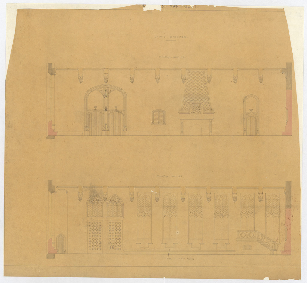 Opschrift: Stadhuis van Gent. Groote benedenzaal Omschrijving plan: opstanden muren Datum KCML: deze informatie wordt niet vermeld op het archiefstuk Archiefnummer: O1699
