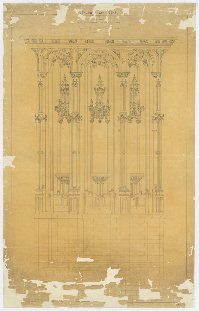 Opschrift: Stadhuis van Gent. Buitenwerk. Hoek der Hoogpoort en der Botermarkt. Zicht van de grond tot onder het balkon Omschrijving plan: detailtekening muur Datum KCML: deze informatie wordt niet vermeld op het archiefstuk Archiefnummer: O1733