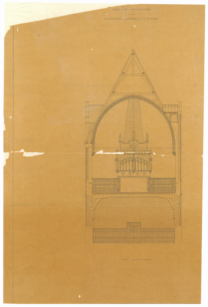 Opschrift: Raad- en arsenaalzaal. Dwarsche doorsnede (overkant), na de herstelling Omschrijving plan: dwarsdoorsnede Datum KCML: deze informatie wordt niet vermeld op het archiefstuk Archiefnummer: O1715