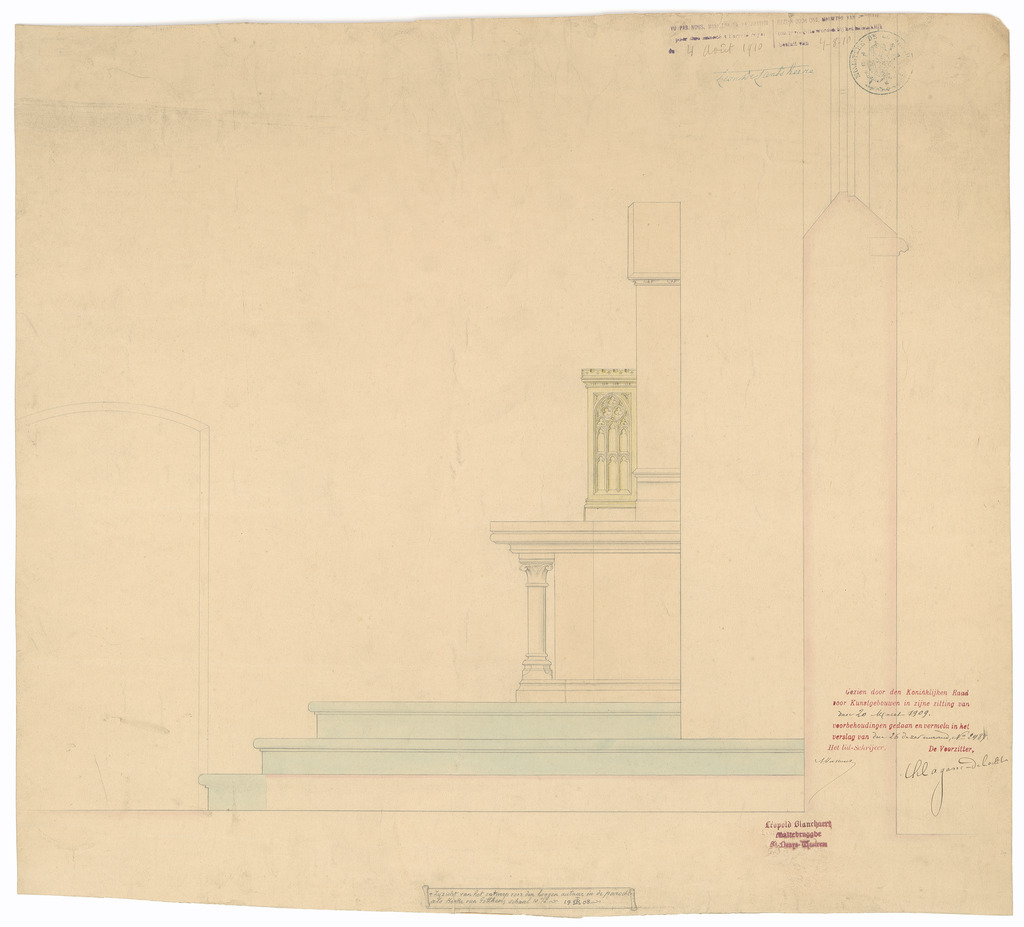 Opschrift: Zijzicht van het ontwerp voor den hoogen autaar in de parochiale kerke van Gotthem Omschrijving plan: ontwerp hoogaltaar: zijaanzicht Datum KCML: 30/03/1909 Archiefnummer: O1834
