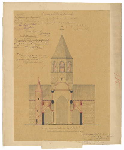 Opschrift: Province de la Flandre Orientale. Eglise paroissiale de Mariakerke. Projet d'agrandissement & de restauration. Omschrijving plan: dwarsdoorsnede Datum KCML: 13/02/1886 Archiefnummer: O1770_02