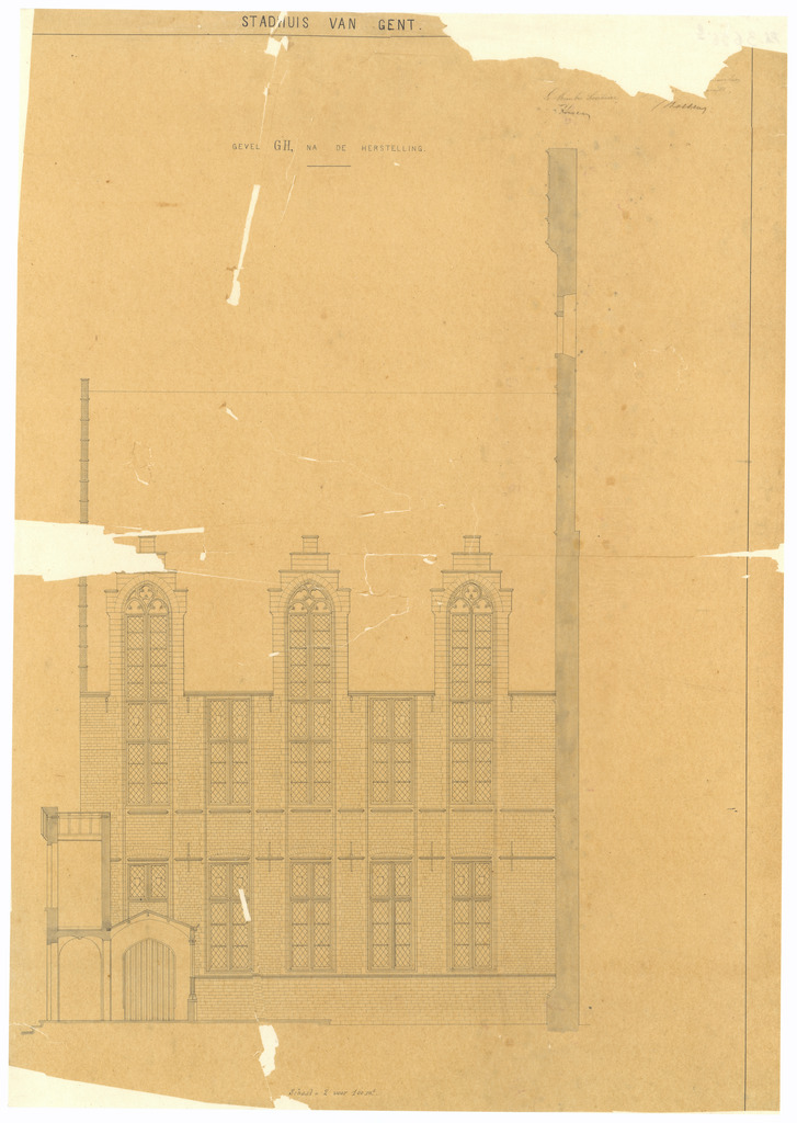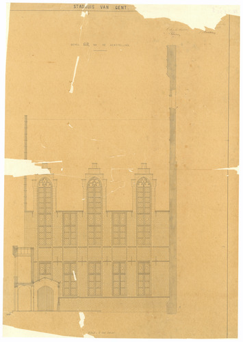 Opschrift: Stadhuis van Gent. Gevel GH na de herstelling Omschrijving plan: opstand gevel Datum KCML: deze informatie wordt niet vermeld op het archiefstuk Archiefnummer: O1727