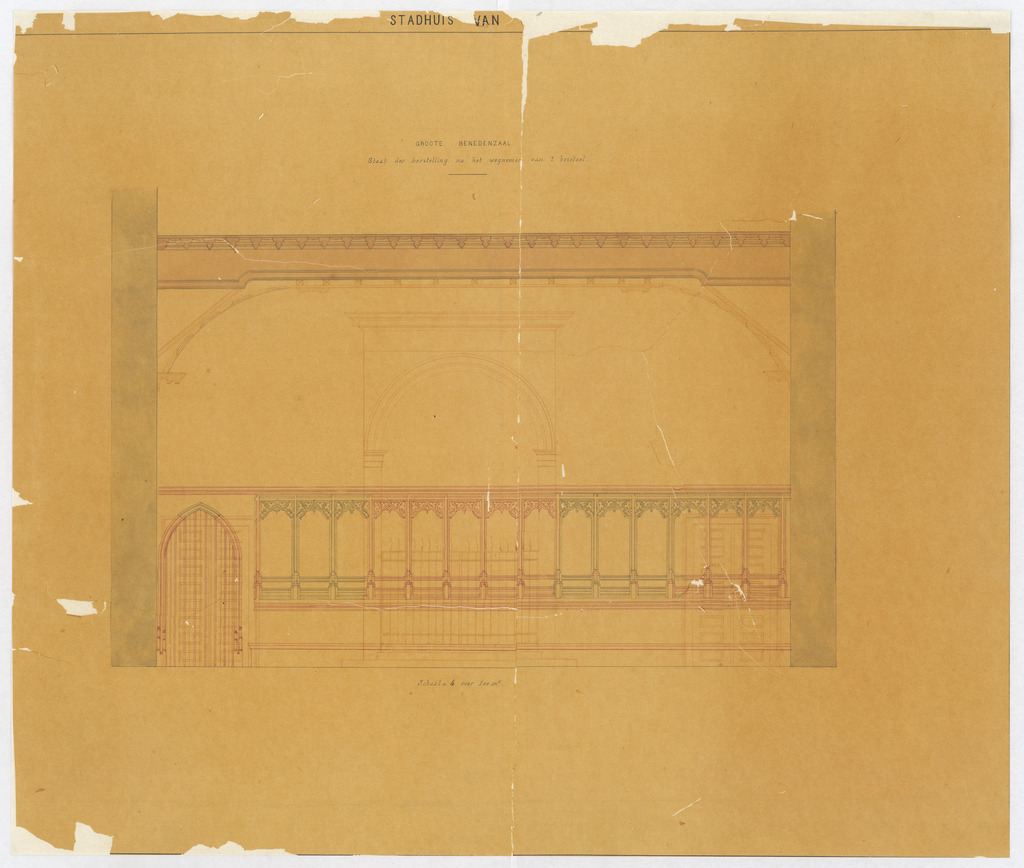 Opschrift: Stadhuis van Gent. Groote benedenzaal. Staat der herstelling na het wegnemen van 't bezetsel Omschrijving plan: opstand muur Datum KCML: deze informatie wordt niet vermeld op het archiefstuk Archiefnummer: O1702