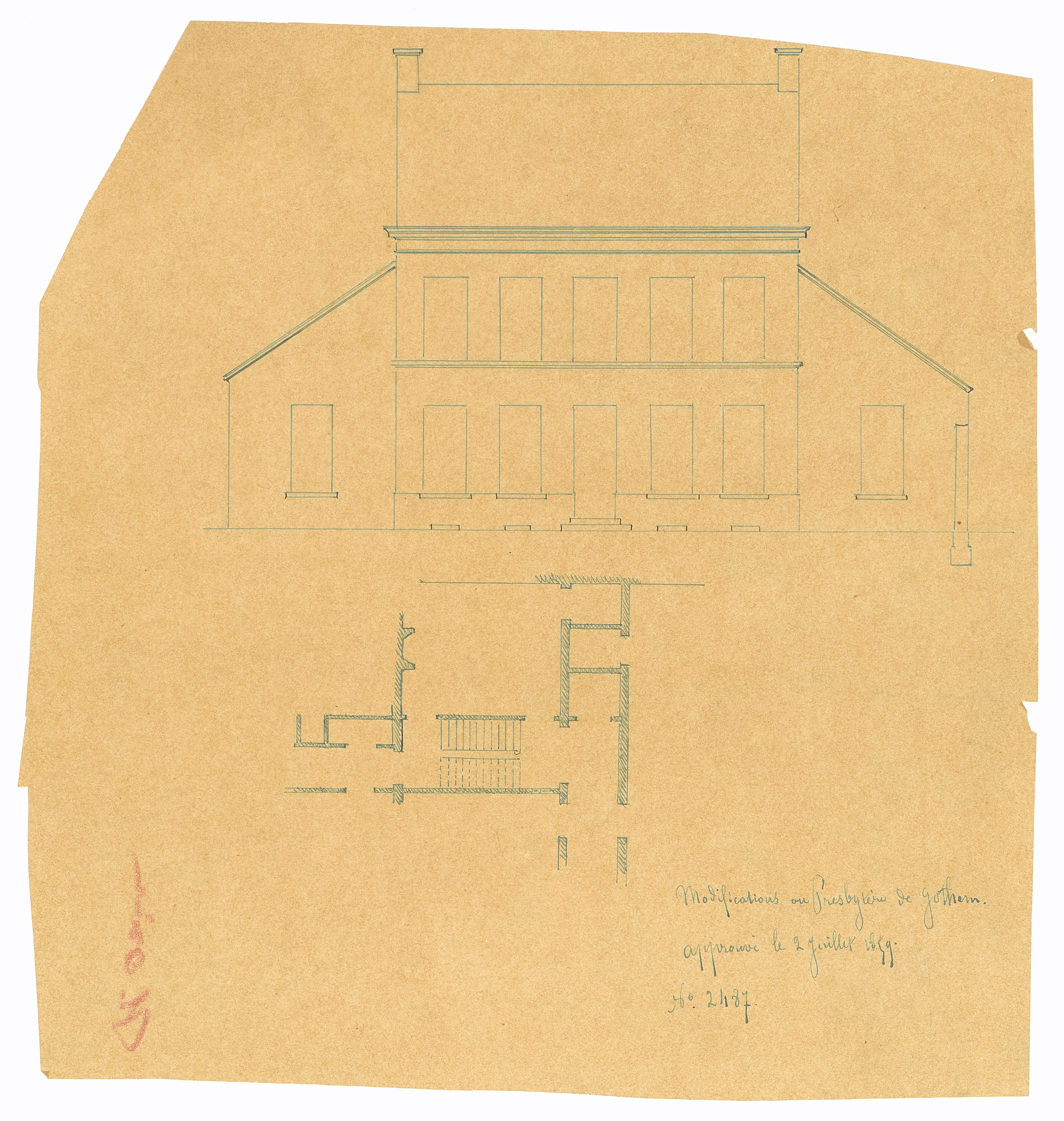 Opschrift: Modifications au Presbytère de Gotthem Omschrijving plan: plattegrond en voorgevel pastorie Datum KCML: 2 /07/1859 Archiefnummer: O1836
