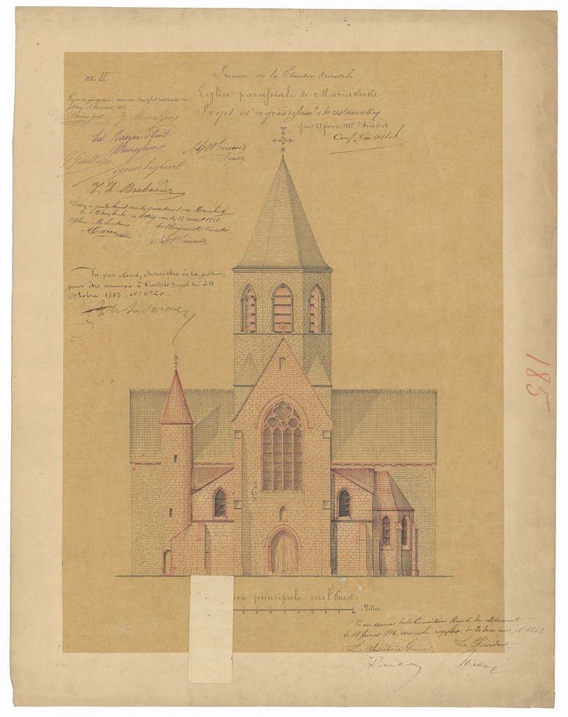 Opschrift: Province de la Flandre Orientale. Eglise paroissiale de Mariakerke. Projet d'agrandissement & de restauration. Omschrijving plan: opstand voorgevel Datum KCML: 13/02/1886 Archiefnummer: O1765_02