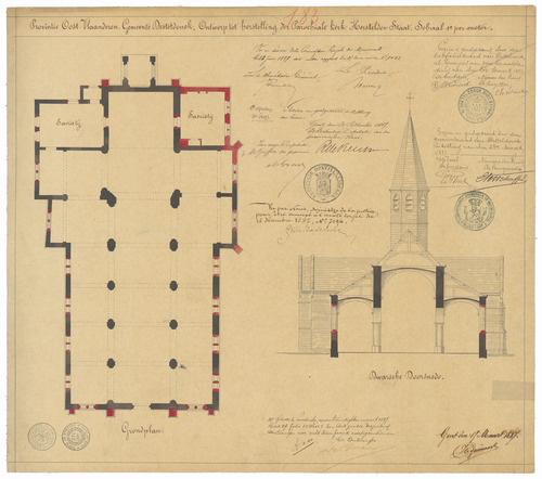 Opschrift: Provincie Oost-Vlaanderen. Gemeente Desteldonck. Ontwerp tot herstelling der parochiale kerk. Herstelden Staat. Omschrijving plan: plattegrond en dwarsdoorsnede Datum KCML: 18/06/1887 Archiefnummer: O1740