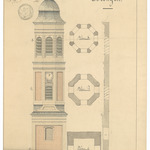 Opschrift: Restauratie van den toren der parochiale kerk te Drongen Omschrijving plan: opstand, plattegronden en doorsnede toren Datum KCML: deze informatie wordt niet vermeld op het archiefstuk Archiefnummer: O1747