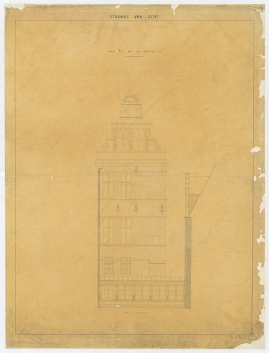 Opschrift: Stadhuis van Gent. Gevel KL na de herstelling Omschrijving plan: opstand gevel Datum KCML: deze informatie wordt niet vermeld op het archiefstuk Archiefnummer: O1730