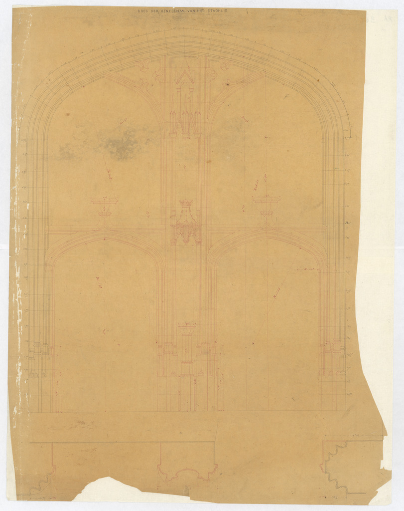 Opschrift: Boog der benedenzaal in het stadhuis Omschrijving plan: detailtekening muur Datum KCML: deze informatie wordt niet vermeld op het archiefstuk Archiefnummer: O1703