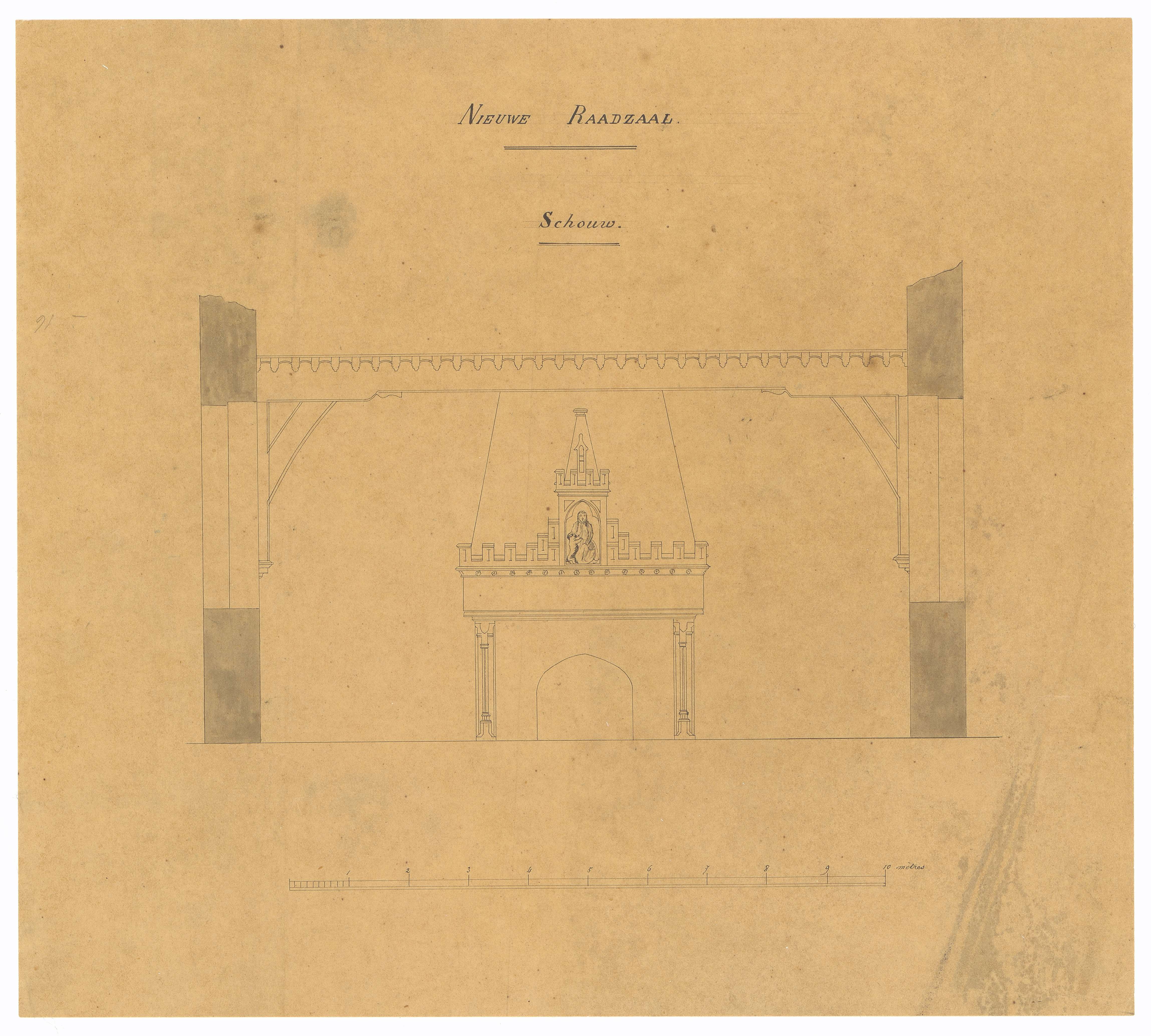 Opschrift: Nieuwe Raadzaal. Schouw Omschrijving plan: vooraanzicht schouw Datum KCML: deze informatie wordt niet vermeld op het archiefstuk Archiefnummer: O1735