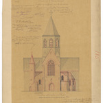 Opschrift: Province de la Flandre Orientale. Eglise paroissiale de Mariakerke. Projet d'agrandissement & de restauration. Omschrijving plan: opstand voorgevel (aangepast ontwerp) Datum KCML: 13/02/1886 Archiefnummer: O1765_01
