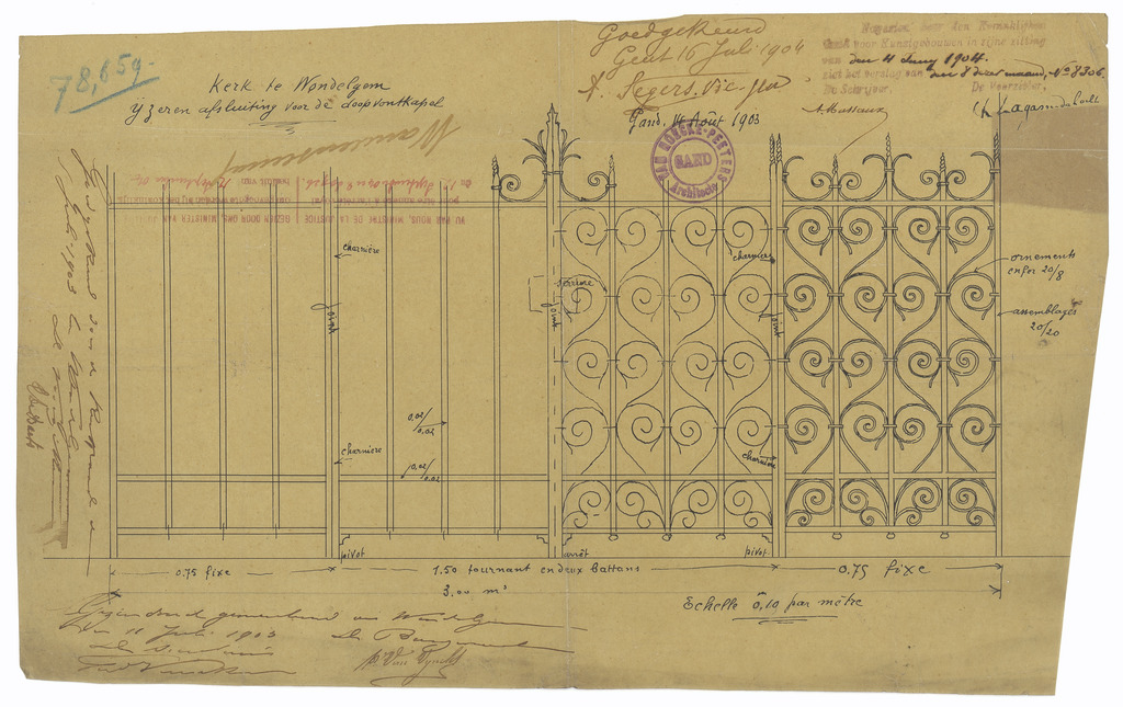Opschrift: Kerk te Wondelgem. Ijzeren afsluiting voor de doopvontkapel Omschrijving plan: ontwerp afsluiting doopkapel Datum KCML: 4-6-1904 Archiefnummer: O1808