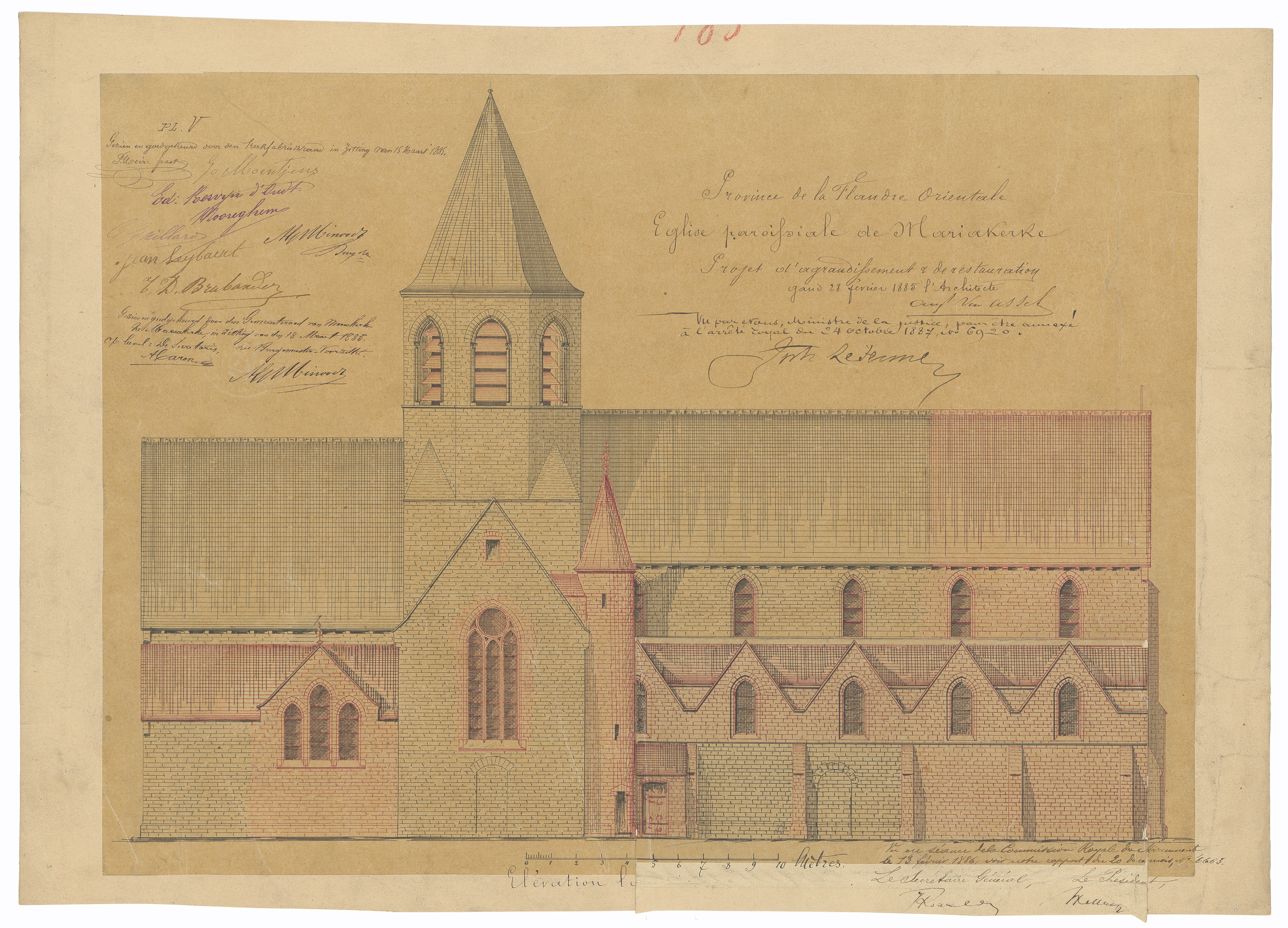 Opschrift: Province de la Flandre Orientale. Eglise paroissiale de Mariakerke. Projet d'agrandissement & de restauration. Omschrijving plan: opstand N-gevel (aangepast ontwerp) Datum KCML: 13/02/1886 Archiefnummer: O1768_01