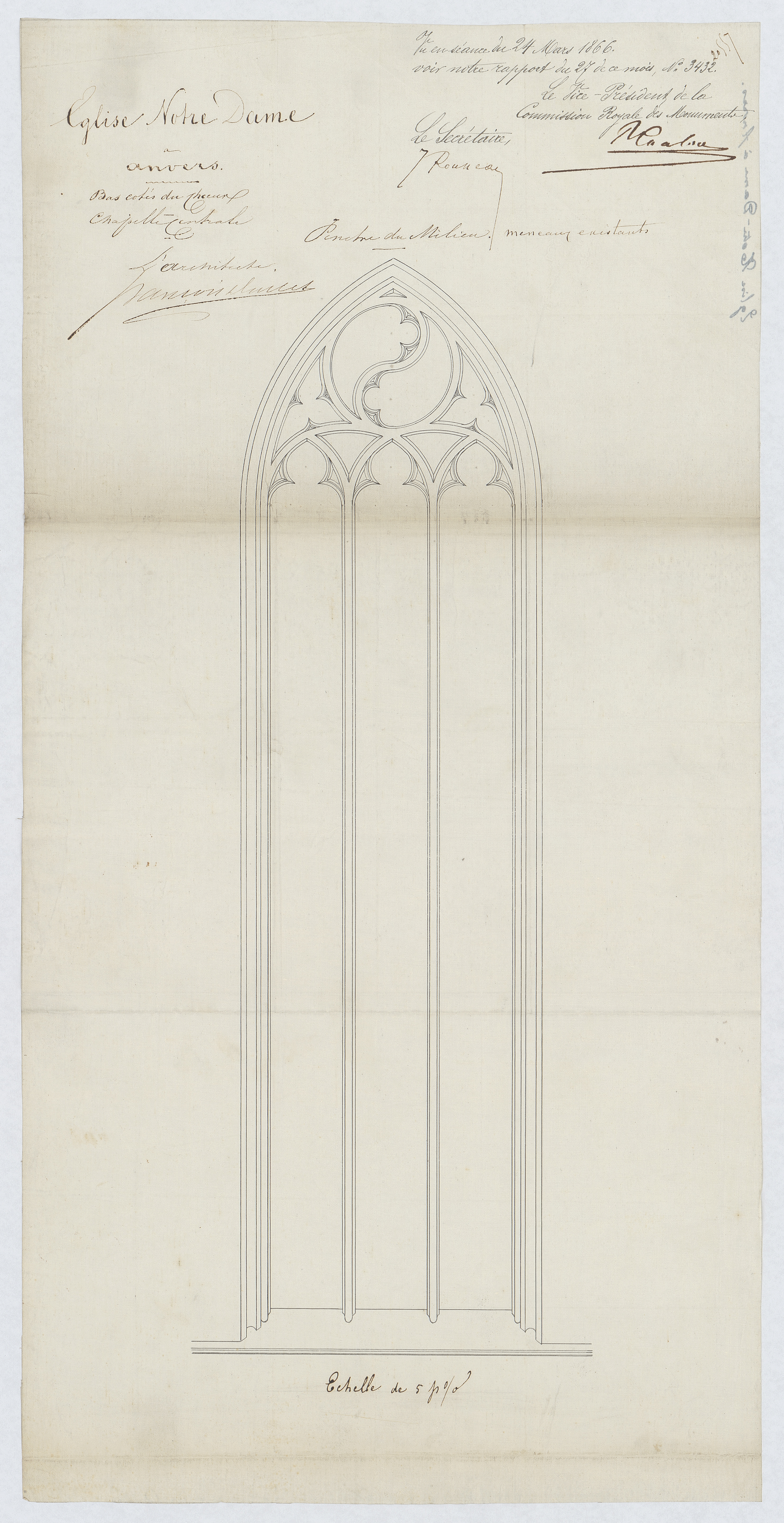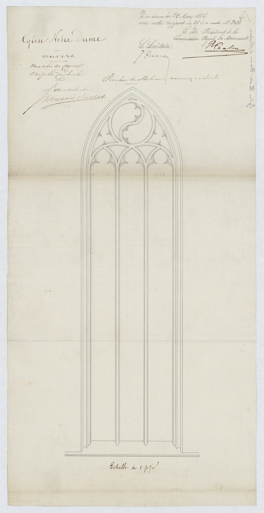 Opschrift: Eglise Notre dame à anvers. bas cotés du choeur . Chapelle centrale. Omschrijving plan: aanzicht venster Datum KCML: 24/03/1866 Archiefnummer: A0020