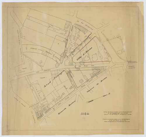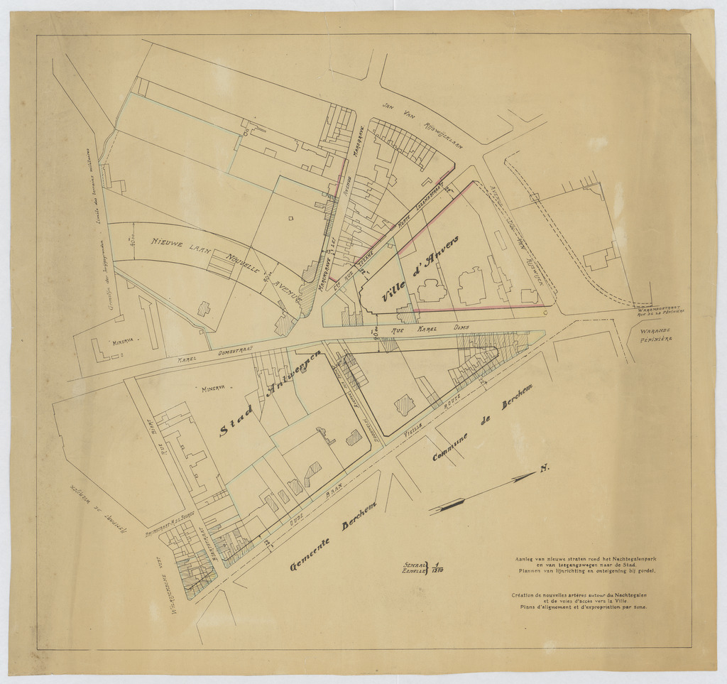 Opschrift: Aanleg van nieuwe straten rond het Nachtegalenpark en van toegangswegen naar de Stad. Plannen van lijnrichting en onteiging bij gordel. Omschrijving plan: stedenbouwkundig ontwerp Datum KCML: deze informatie wordt niet vermeld op het archiefstuk Archiefnummer: A0003