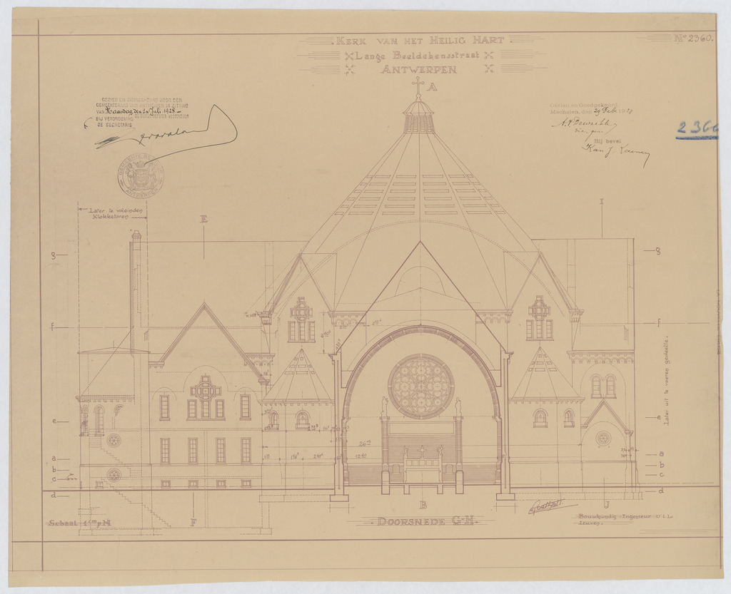 Opschrift: Kerk van het Heilig Hart. Lange Beeldekensstraat Antwerpen. Omschrijving plan: dwarsdoorsnede Datum KCML: deze informatie wordt niet vermeld op het archiefstuk Archiefnummer: A0096