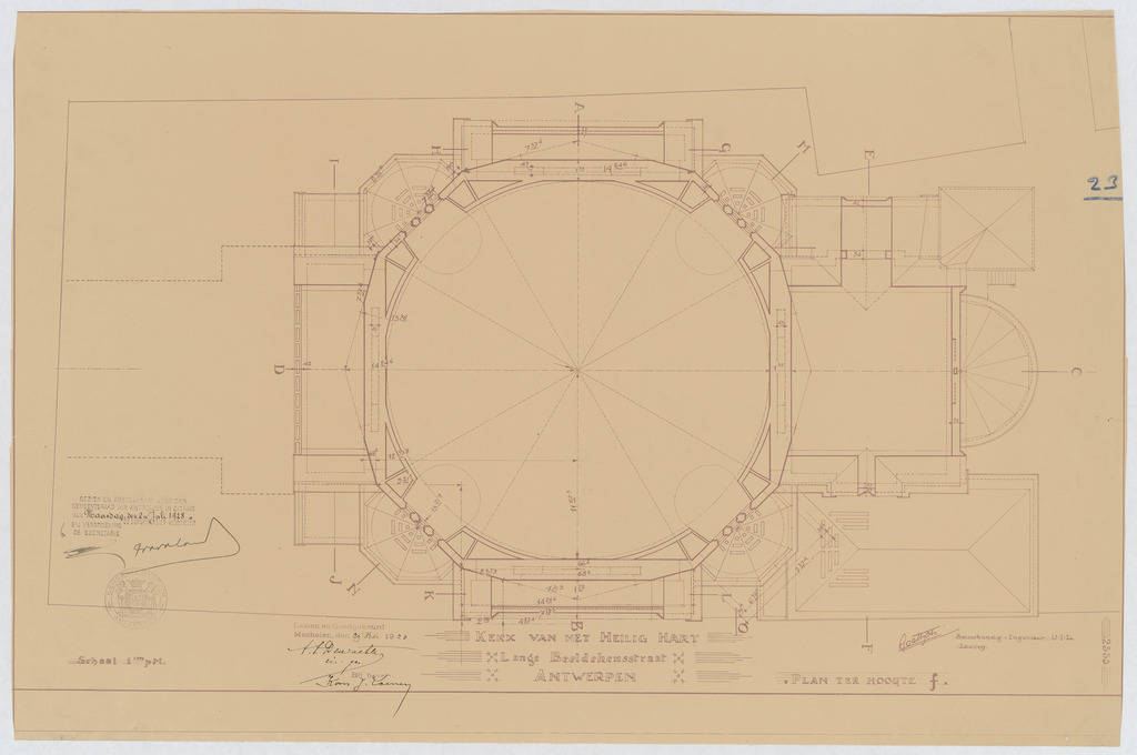 Opschrift: Kerk van het Heilig Hart. Lange Beeldekensstraat Antwerpen. Plan ter hoogte f. Omschrijving plan: plattegrond niveau 2 Datum KCML: deze informatie wordt niet vermeld op het archiefstuk Archiefnummer: A0090