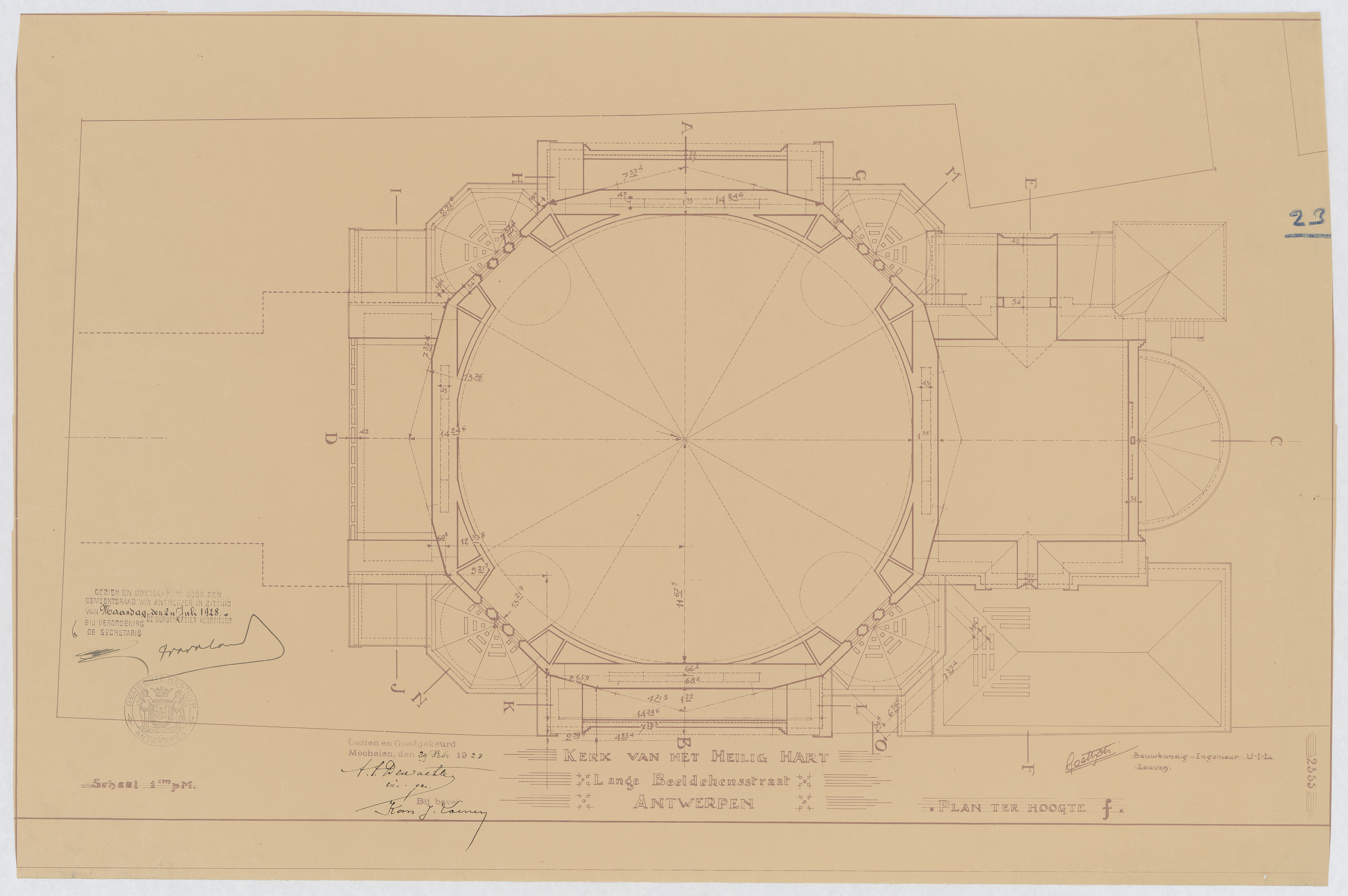 Opschrift: Kerk van het Heilig Hart. Lange Beeldekensstraat Antwerpen. Plan ter hoogte f. Omschrijving plan: plattegrond niveau 2 Datum KCML: deze informatie wordt niet vermeld op het archiefstuk Archiefnummer: A0090