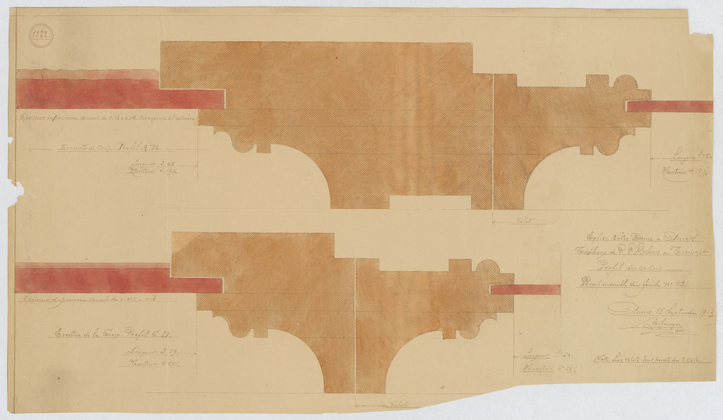 Opschrift: Eglise Notre Dame à Anvers.Tableaux de P.P. Rubens au Transept. Profil des cadres. Omschrijving plan: doorsneden kaders schilderijen Datum KCML: deze informatie wordt niet vermeld op het archiefstuk Archiefnummer: A0038