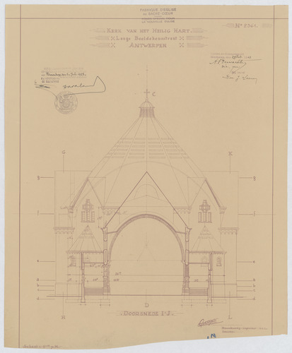 Opschrift: Kerk van het Heilig Hart. Lange Beeldekensstraat Antwerpen. Omschrijving plan: dwarsdoorsnede Datum KCML: deze informatie wordt niet vermeld op het archiefstuk Archiefnummer: A0098