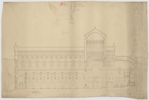 Opschrift: Projet d'église pour la paroisse des S.S. Michel et Pierre à Anvers. Coupe longitudinale. Omschrijving plan: langsdoorsnede Datum KCML: 1 /10/1892 Archiefnummer: A0168