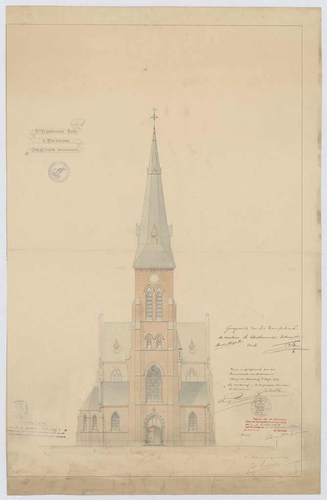 Opschrift: St. Lambertus kerk te Antwerpen. Omschrijving plan: opstand voorgevel Datum KCML: 30/10/1909 Archiefnummer: A0161