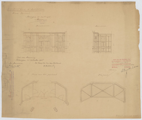 Opschrift: Sint Joris Kerk te Antwerpen. Nieuw portaal. Omschrijving plan: plattegrond, plattegrond plafond, opstand en doorsnede van het portaal Datum KCML: 6 /01/1906 Archiefnummer: A0153