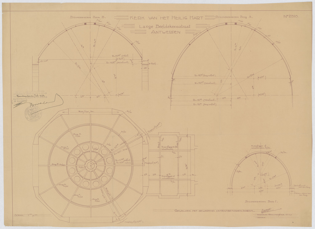 Opschrift: Kerk van het Heilig Hart. Lange Beeldekensstraat Antwerpen. Omschrijving plan: dwarsdoorsnede, doorsnede en aanzicht gewelven Datum KCML: deze informatie wordt niet vermeld op het archiefstuk Archiefnummer: A0107