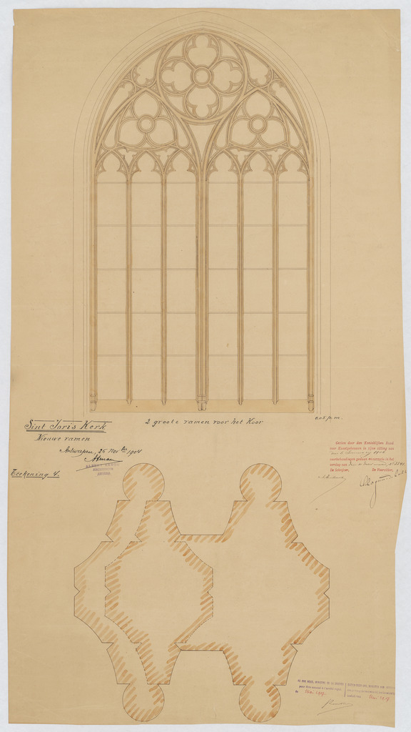 Opschrift: Sint Joris Kerk. Nieuwe ramen. 2 grote ramen voor het Koor. Omschrijving plan: aanzicht venster, doorsnede profiel Datum KCML: 6 /01/1906 Archiefnummer: A0152