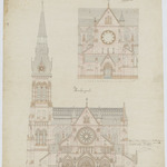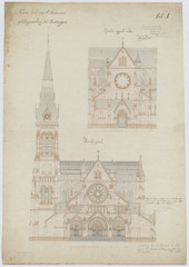 Opschrift: Nieuwe Kerk van St. Amandus op Stuyvenberg tot Antwerpen. Omschrijving plan: opstand voorgevel, opstand zijgevel Datum KCML: 18/09/1869 Archiefnummer: A0109