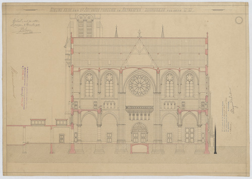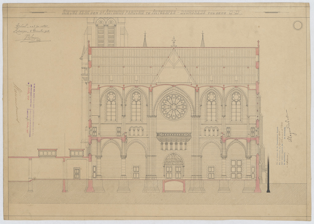 Opschrift: Nieuwe kerk der St. Antonius parochie in Antwerpen. Doorsnede volgens C-D. Omschrijving plan: dwarsdoorsnede, dwarsdoorsnede naar het portaal Datum KCML: 8 /04/1905 Archiefnummer: A0124