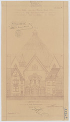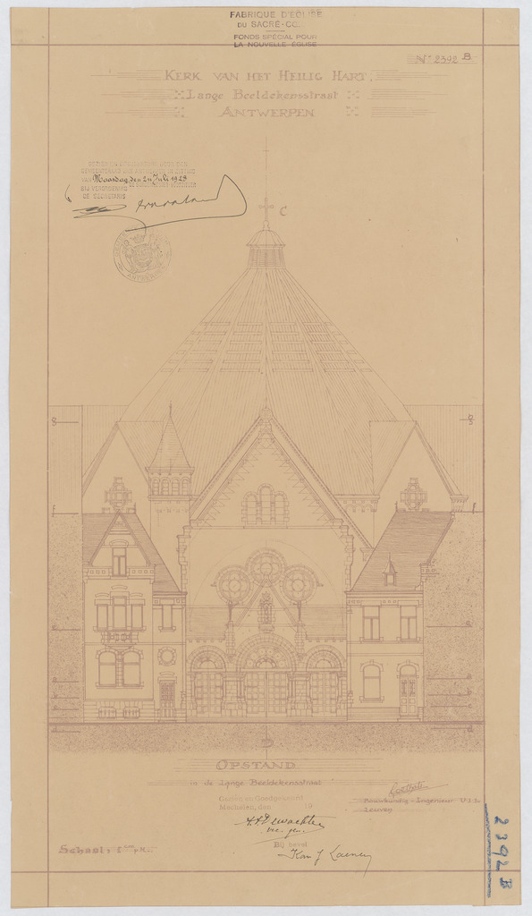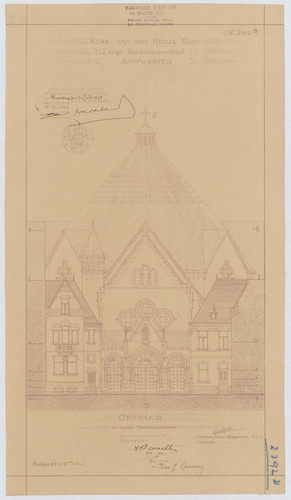 Opschrift: Kerk van het Heilig Hart. Lange Beeldekensstraat Antwerpen. Omschrijving plan: opstand W-gevel Datum KCML: deze informatie wordt niet vermeld op het archiefstuk Archiefnummer: A0106