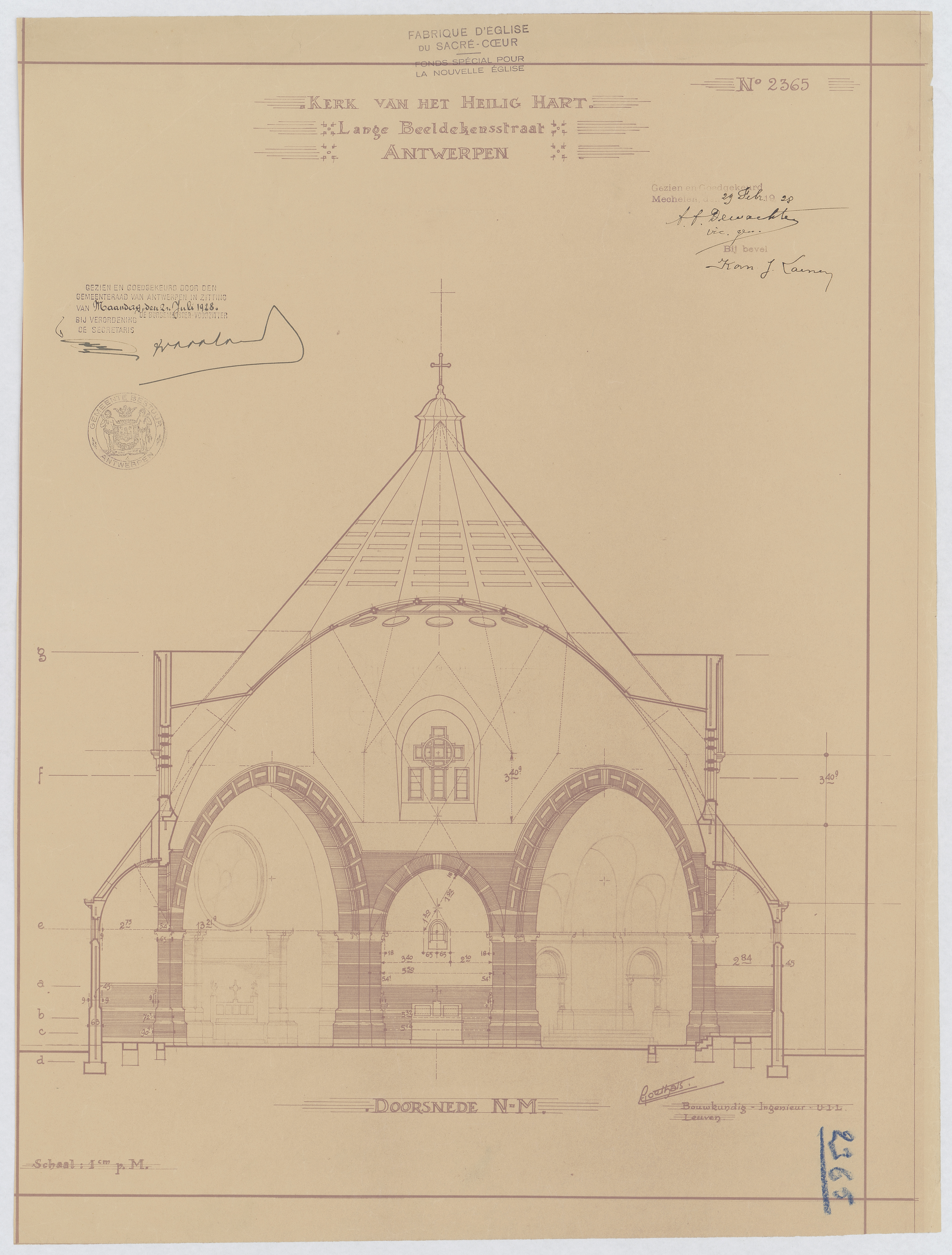 Opschrift: Kerk van het Heilig Hart. Lange Beeldekensstraat Antwerpen. Omschrijving plan: dwarsdoorsnede Datum KCML: deze informatie wordt niet vermeld op het archiefstuk Archiefnummer: A0104