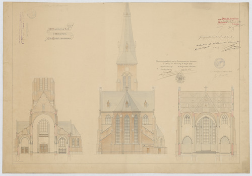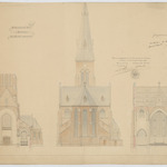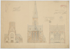 Opschrift: St. Lambertus kerk te Antwerpen. Omschrijving plan: opstand achtergevel, dwarsdoorsnede naar het koor, dwarsdoorsnede naar het portaal Datum KCML: 30/10/1909 Archiefnummer: A0162
